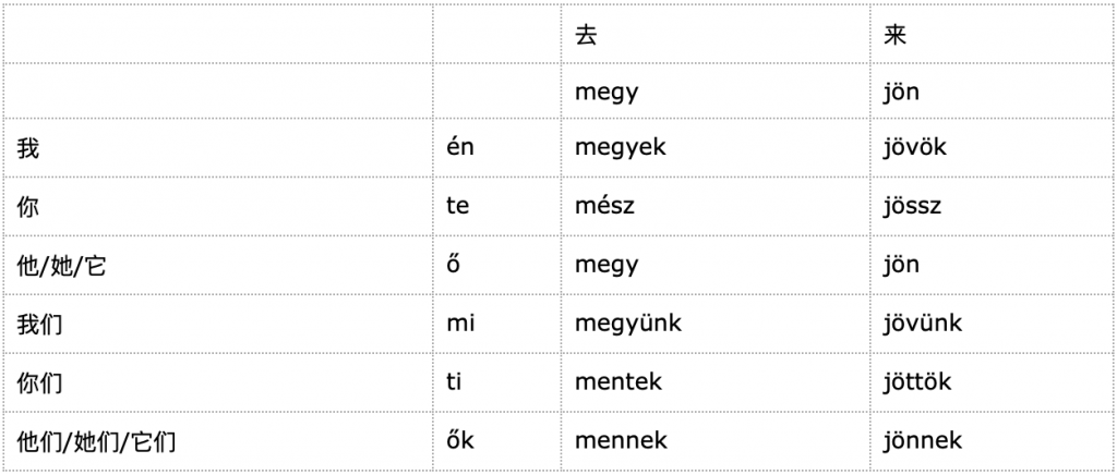 我们现在知道怎么说“在”,就是”van”。比如“我在办公室。“就是”irodában vagyok.”(别忘了,匈牙利人说话一般都是省略“我(én)“的。)我们在学两个词“去(megy)“和”来(jön)”。它们的变形是不规则的,它们在句子中是这样变形的,