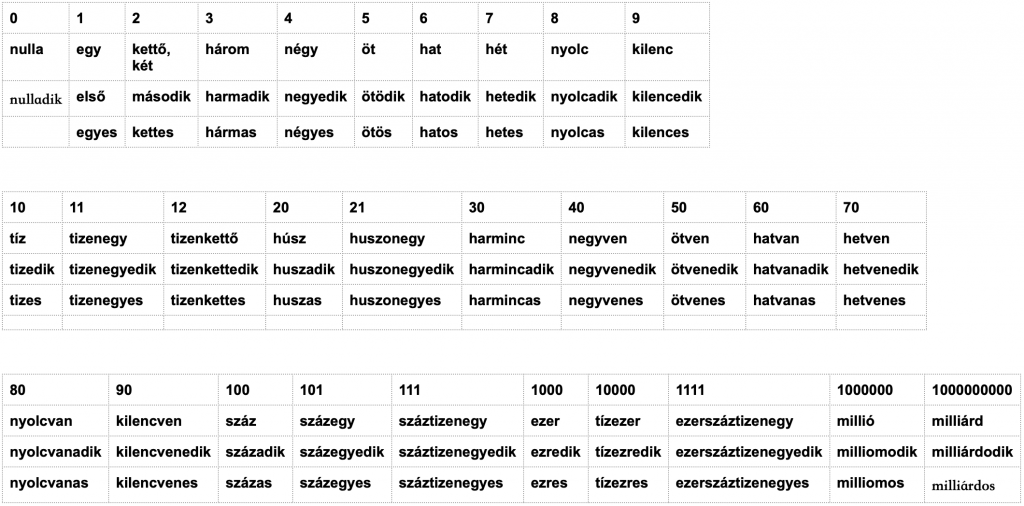 匈语数字有若干形式。常见的有三种,基本形式,序数形式和形容词形式。如下