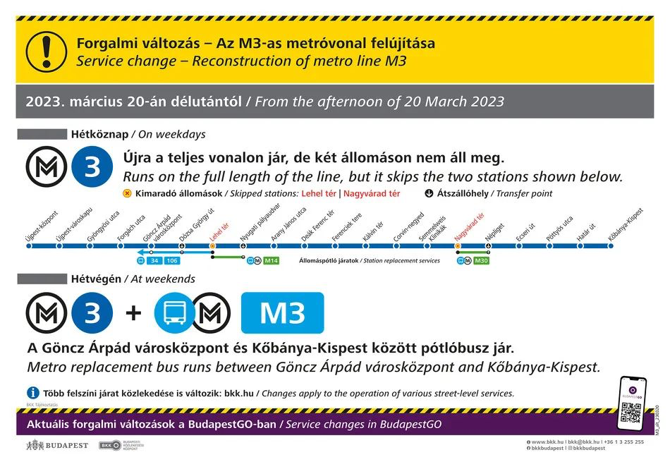 1、Lehel tér站和Nagyvárad tér站暂时关闭,列车在这两站过站不停车,乘客暂时只能在就近的Nyugati pályaudvar站和Népliget站上下车,接驳穿梭巴士M14路和M30路,或者其他公交线路和公共自行车Bubi。
