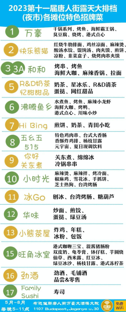 • 大排档(夜市)整个区域均已覆盖免费WiFi